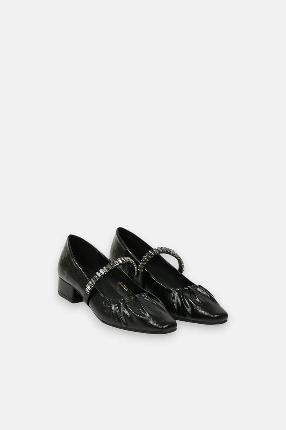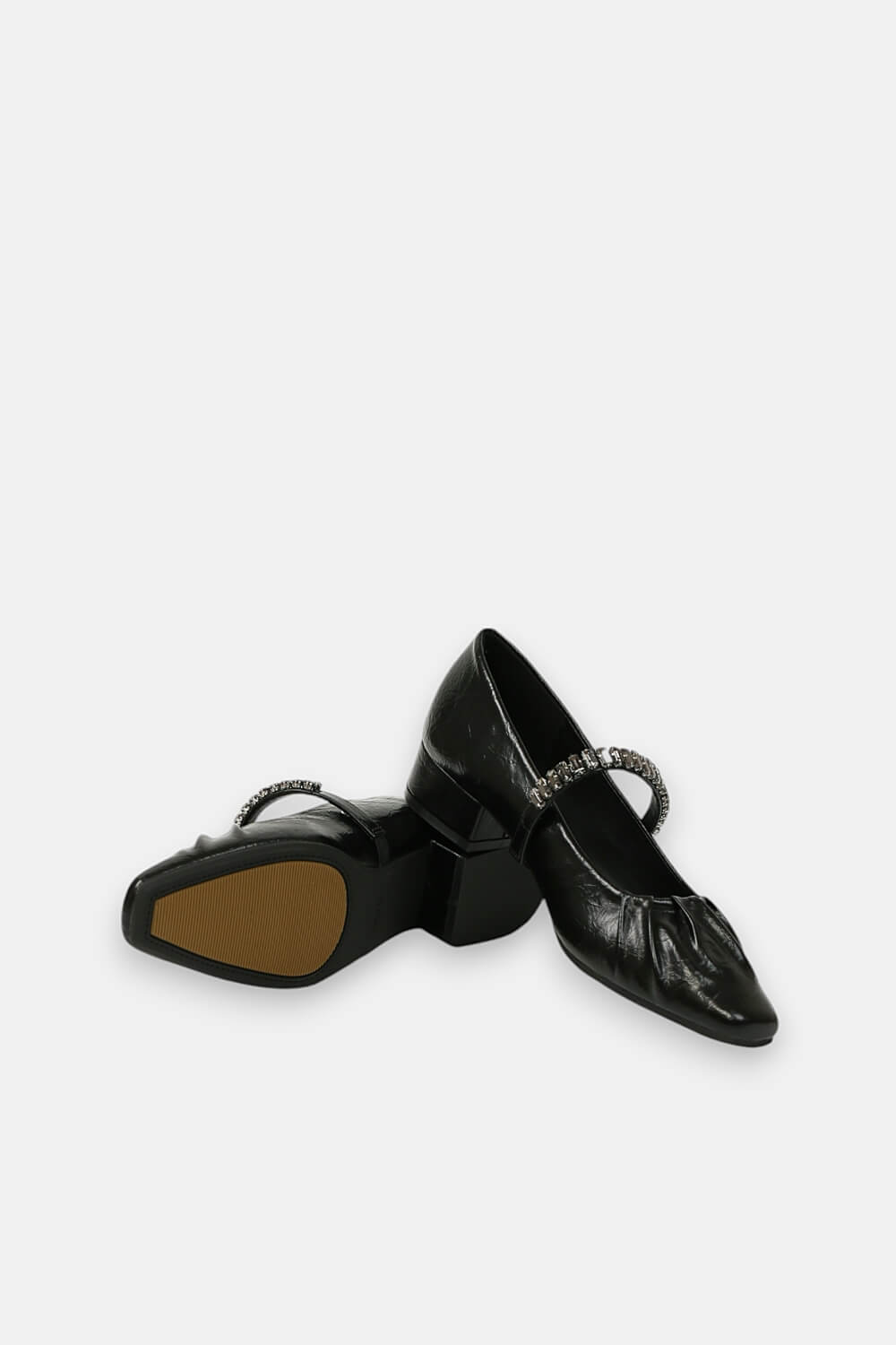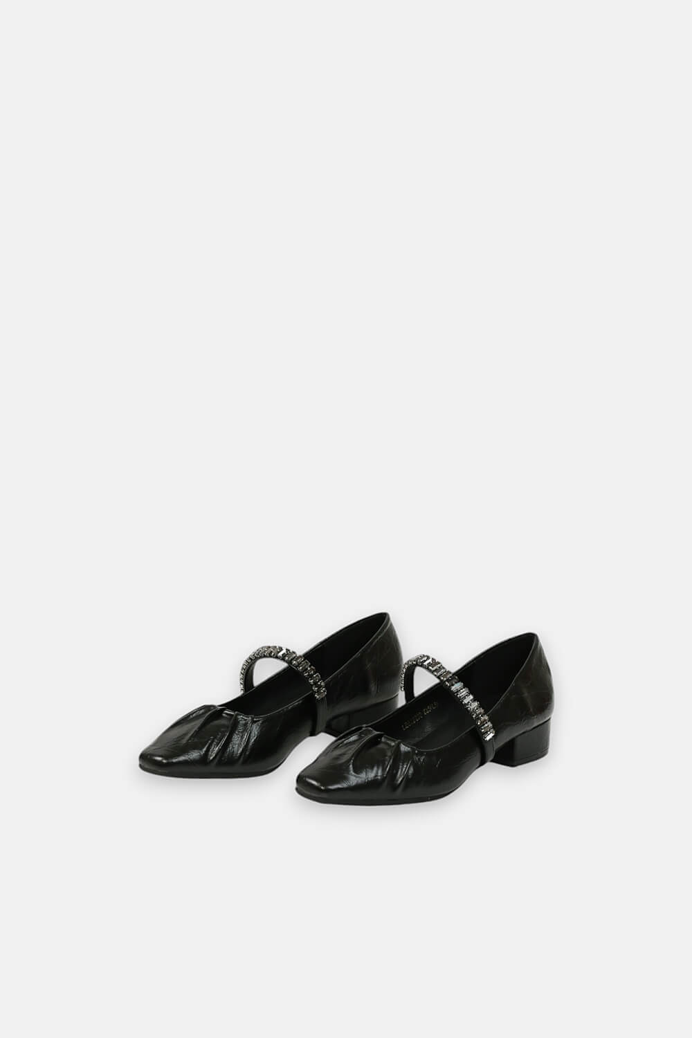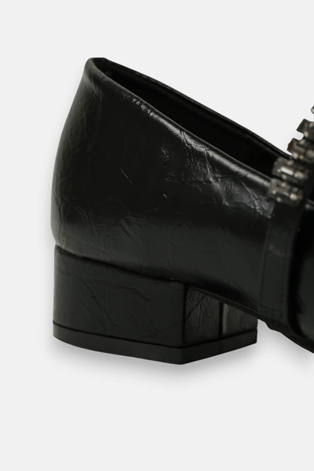 Giày mũi vuông kết hợp đế ba phân góp phần tạo nên sự thoải mái. Quai giày cách điệu đính đá sang trọng
